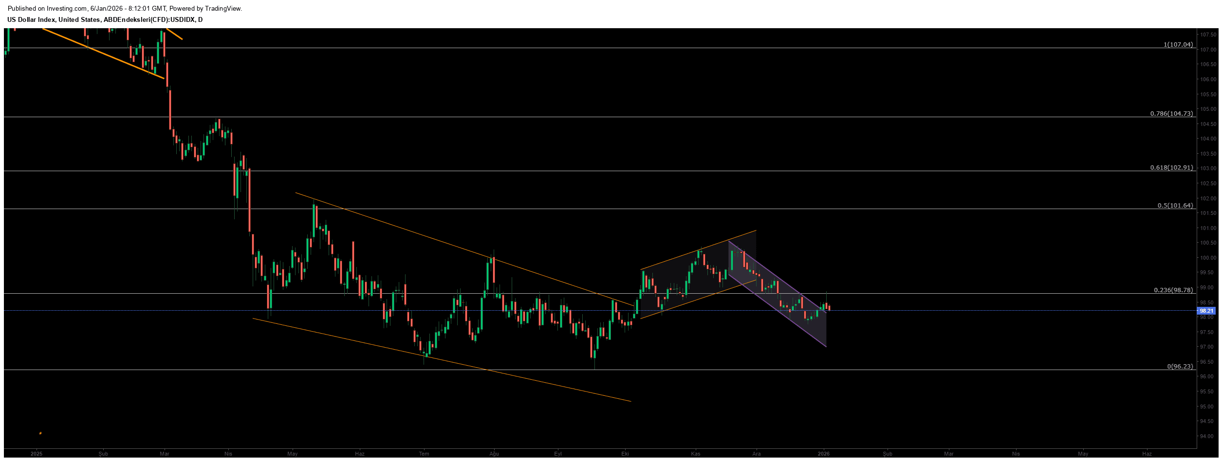 DXY şu anda mor düşen kanalın üst bandına ve aynı zamanda 0.236 Fibonacci seviyesi olan 98.78’e dayanmış durumda; yani tam anlamıyla yönün belli olacağı kritik bir eşikte. Grafikte ana trend hâlâ aşağı, ancak son toparlanma hareketi ile fiyat kısa vadeli bir güçlenme denemesi yapıyor. Eğer DXY bu direnç bandını yukarı kırar ve 99.00 üzerinde kapanışlar alırsa, kısa vadede 99.60 – 100.50 aralığına doğru bir tepki yükselişi başlatabilir. Aksi durumda, bu bölgeden gelecek bir reddediş düşüş trendini yeniden devreye alır ve fiyat önce 98.20 – 97.90’a, daha sonra da satış baskısının devamıyla 96.23 ana desteğine doğru geri çekilebilir.